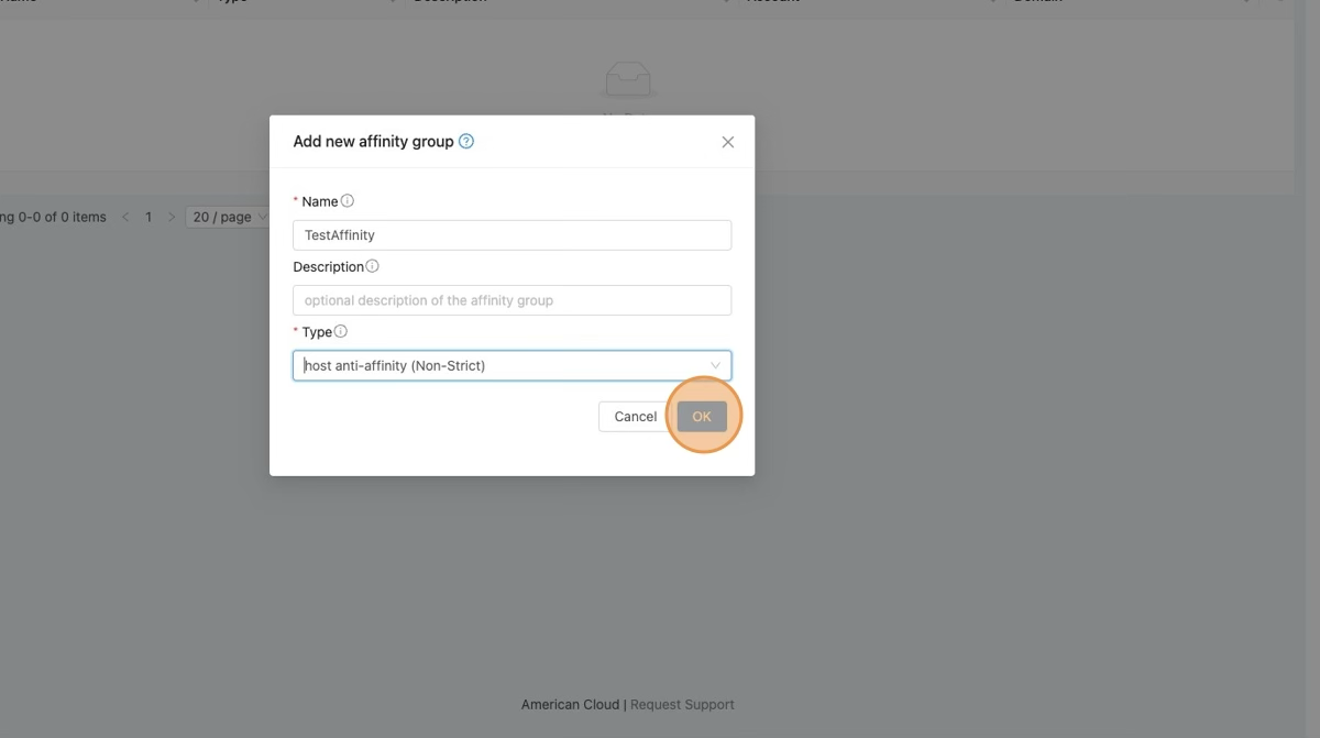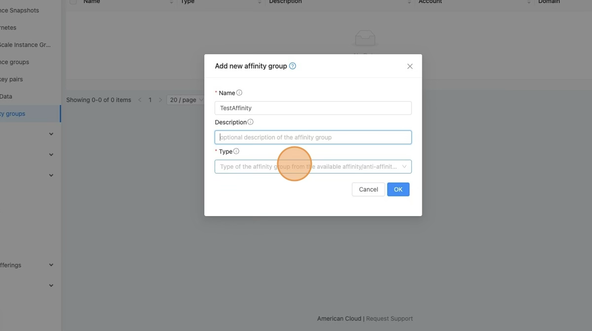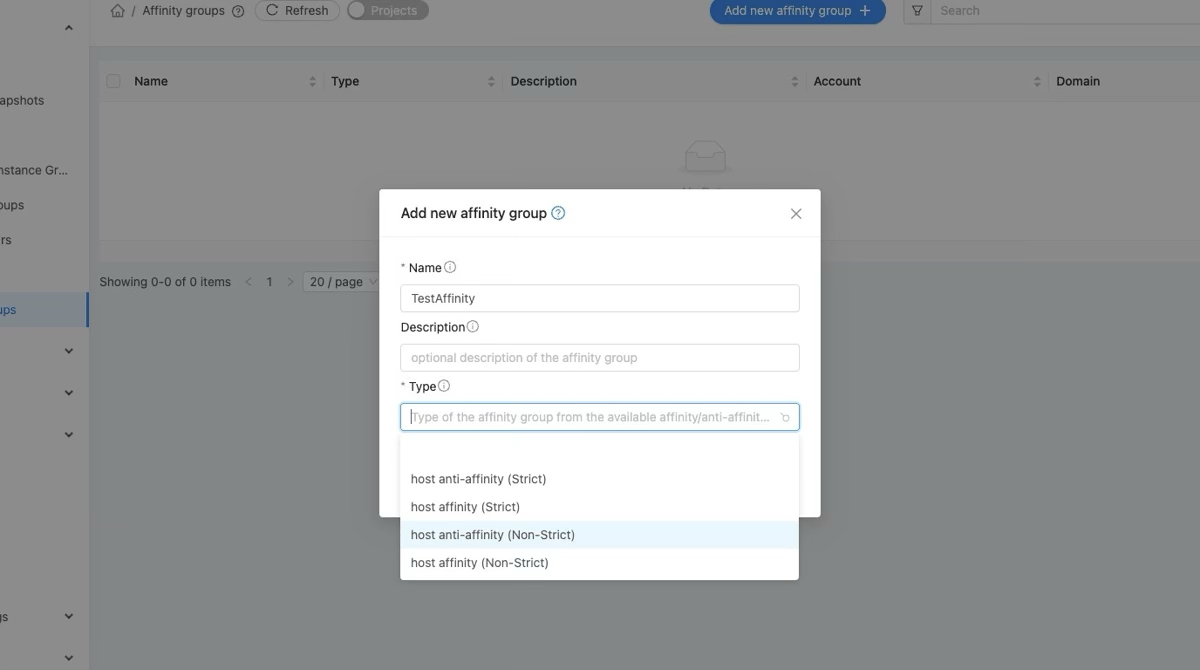 - From the left menu choose Compute > Affinity Groups, click Add new Affinity Group.