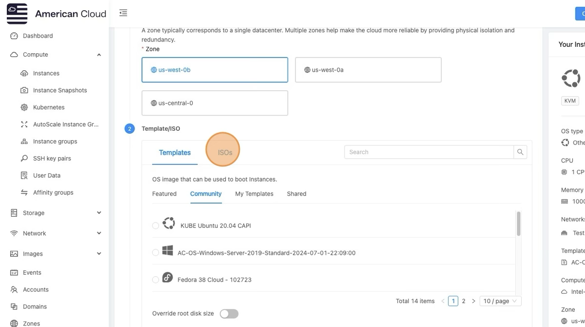Select a Compute Offering for your Instance, which determines how many CPU cores and memory is allocated to the server or Create a custom offering.