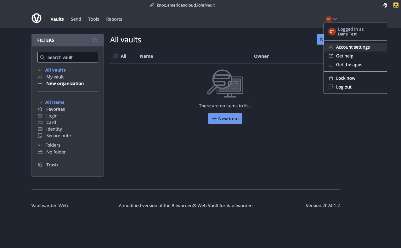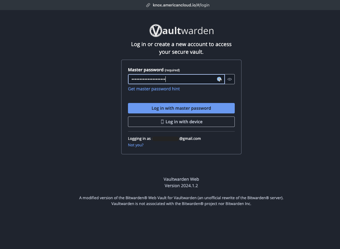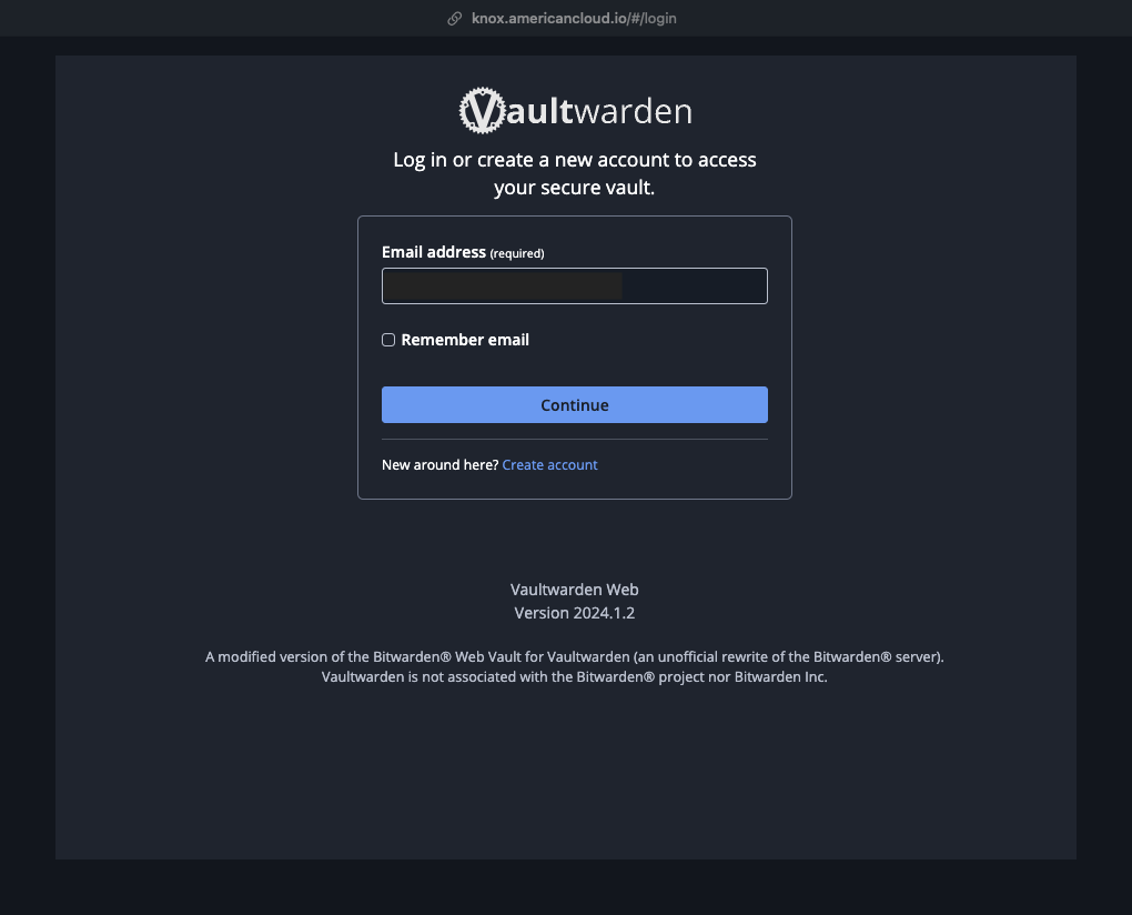 Important: For new user’s of American Cloud’s Knox Create a new account using the “Create Account” button. Even if you have a current BitWarden or VaultWarden account DO NOT try to Log In, Knox is a unique Vault with its own unique Domain(knox.americancloud.io).