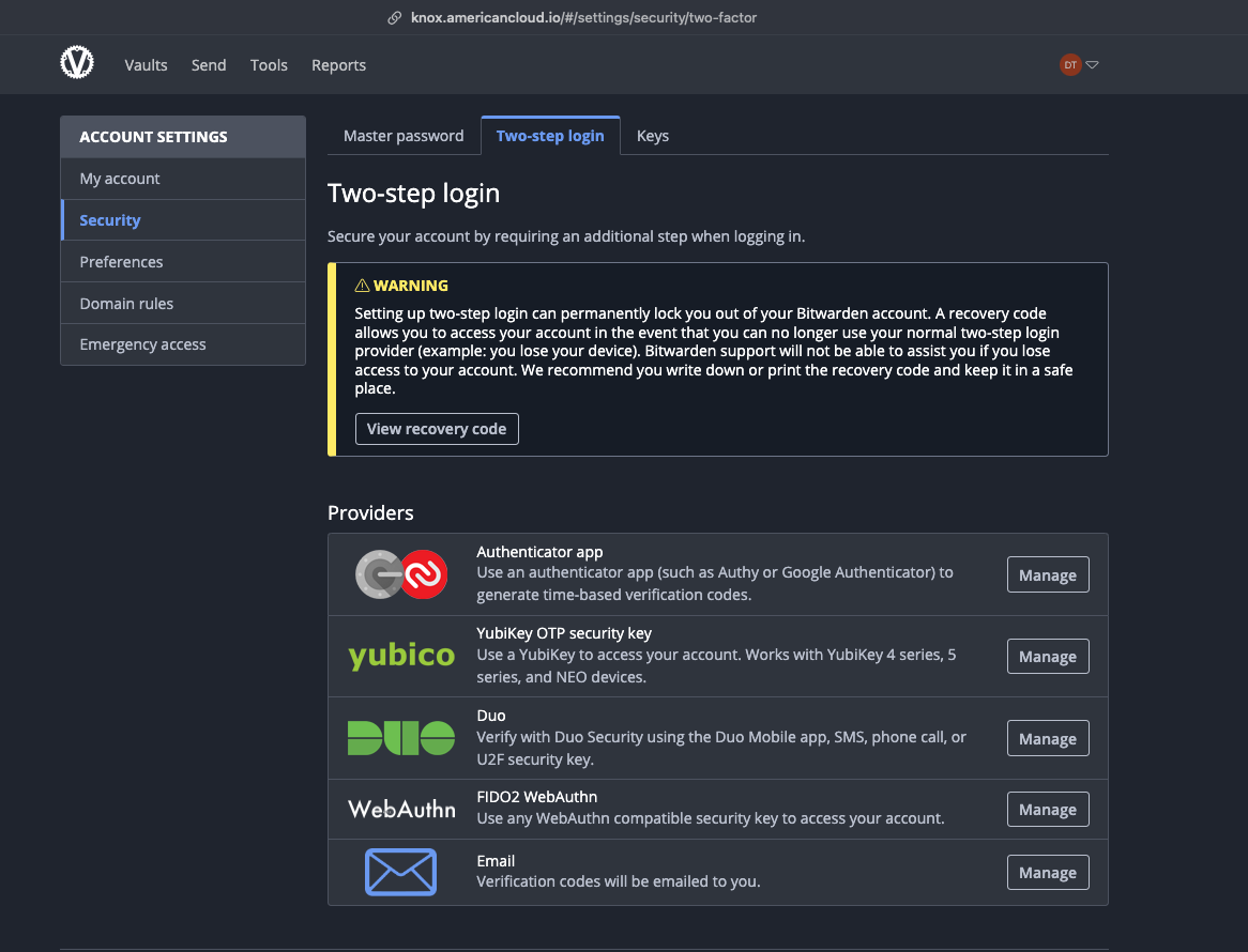 Knox is American Cloud's self-hosted credential platform based off of the trusted BitWarden Password Management application. As such, Knox provides a secure means for American Cloud to share and manage sensitive data with our clients via customized organizations and vaults. Knox provides a combination of both asymmetric and asymmetric encryption that protects sensitive information as it is shared, as well as organizational policies that ensure compliance with AICPA SOC2 Type 2 / Privacy Shield, GDPR, and CCPA regulations. All logins stored on Knox reside in an encrypted vault, utilizing AES-CBC 256 bit encryption, salted hashing, and PBKDF2 SHA-256 algorithms.
