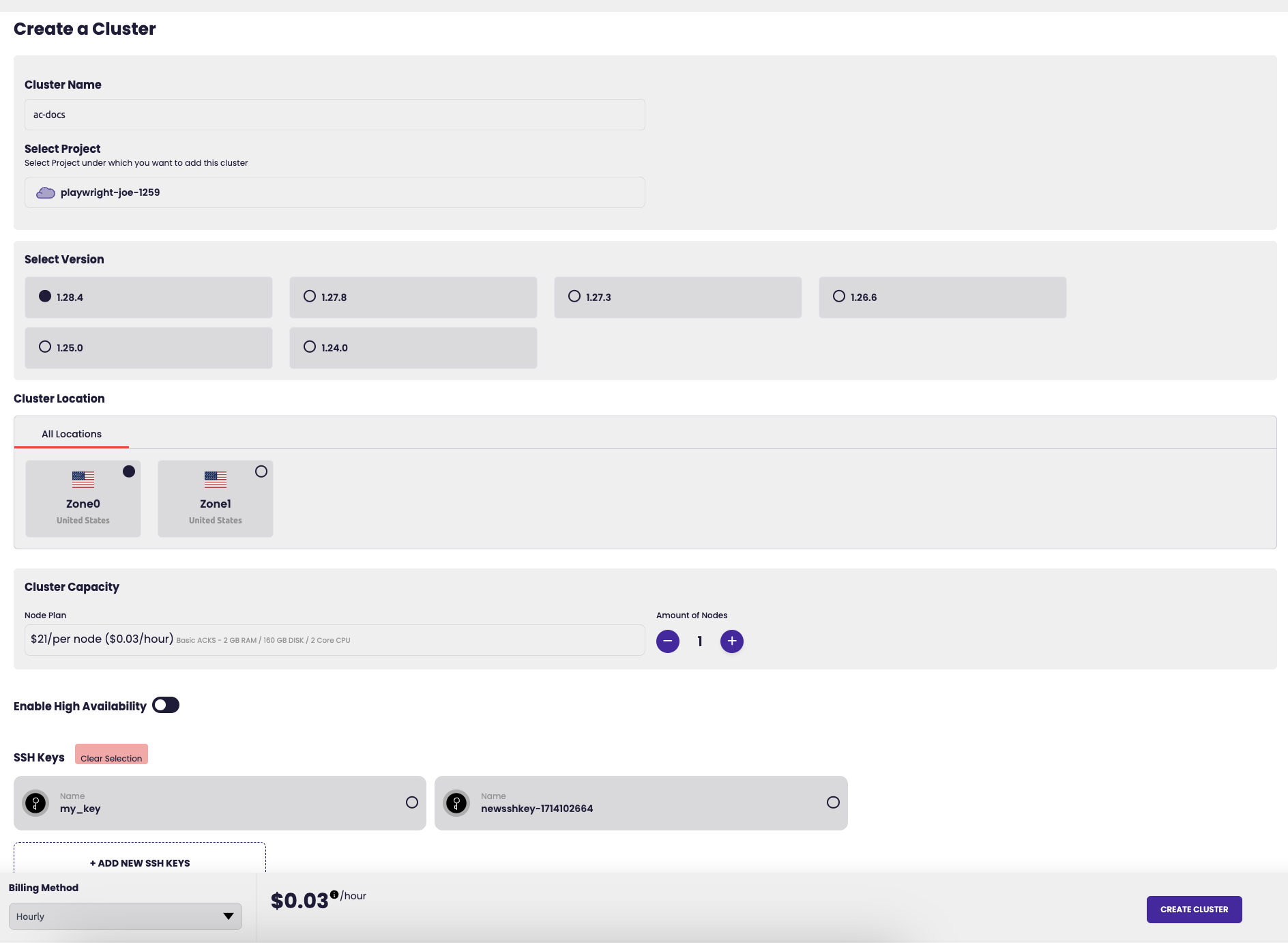 High availability (HA) is a characteristic of a system or application that ensures it remains operational and accessible for users even in the presence of hardware failures, software failures, or other types of disruptions. In the context of Kubernetes, HA refers to the ability of a Kubernetes cluster to continue running and serving containerized applications even when some components or nodes within the cluster experience failures. Pricing for HA depends on the number of nodes added and which plan is selected.