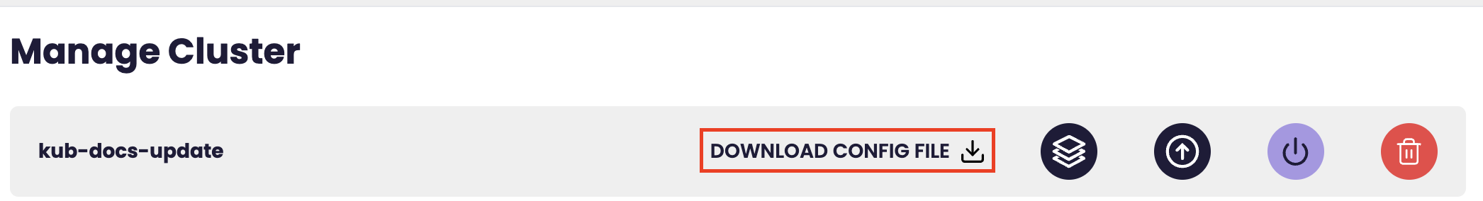 From the Kubernetes page, select the cluster you need the kubeconfig file. You will then be given the option to download the Config File. This will be downloaded to your work station.
