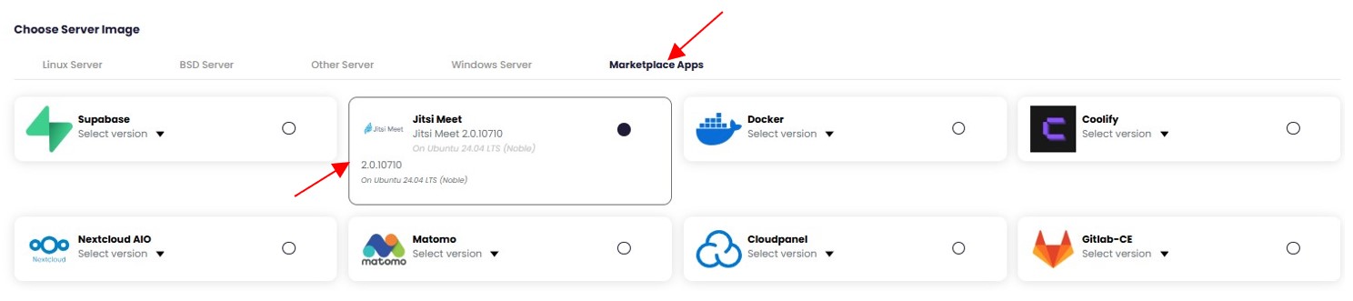 After choosing your Zone, Network, click on the Marketplace Apps tab, select Jitsi Meet and pick your desired version.