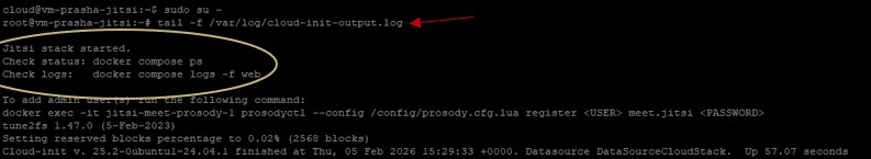 If the output displays "Jitsi stack started", it confirms that the deployment completed successfully and DNS is configured correctly.