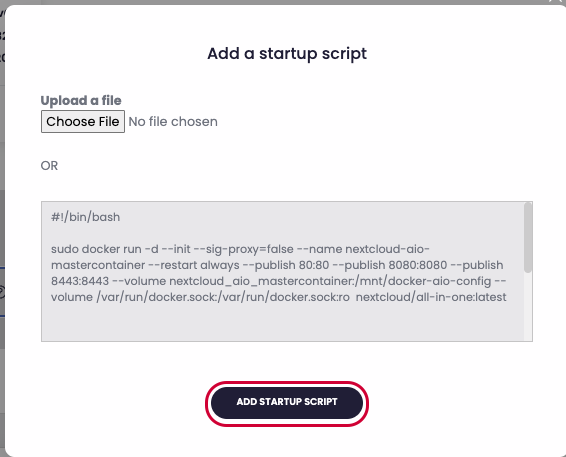 - Select "ADD STARTUP SCRIPT" in the popup. This will run the initial command to build Nextcloud AIO.