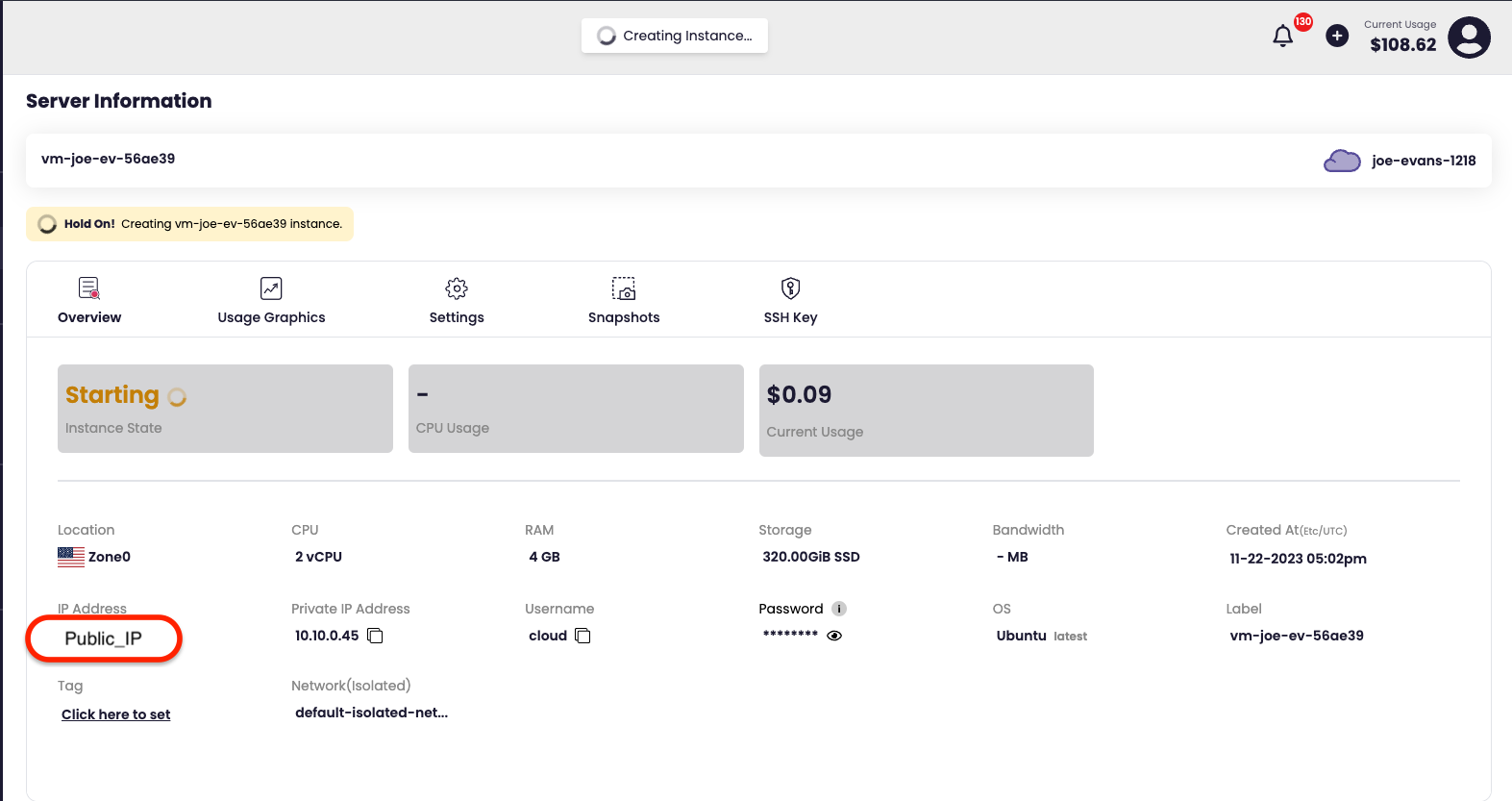 - Once the VM build is complete open a browser and navigate to https://public_ip:8080. Be sure to annotate the password on this page before proceeding.
