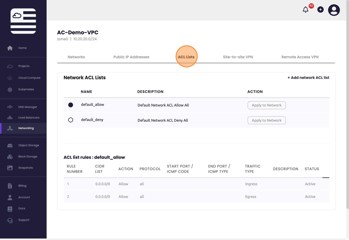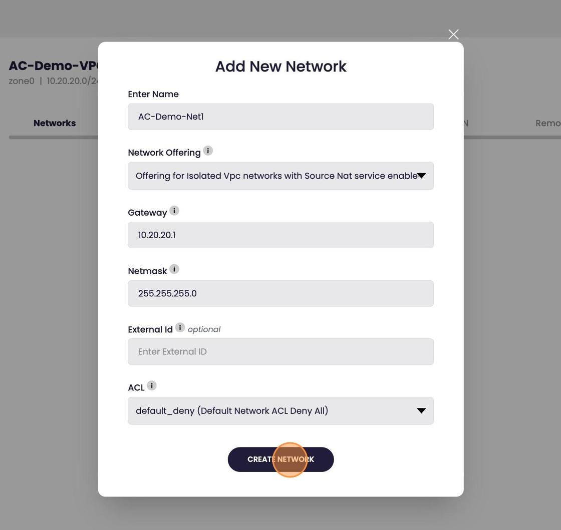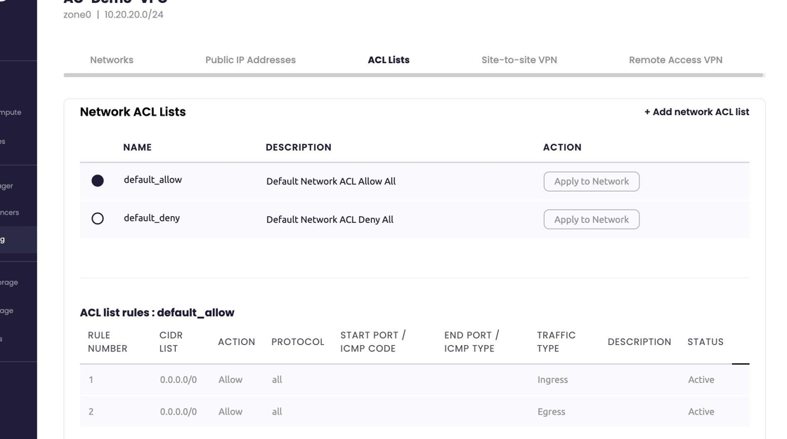 - Select the default ACL. This field provides the ability to assign a default 'permit-all (default_allow)' or 'deny-all (default_deny)' rule for the new network. Individual exceptions can be configured within the VPC.
