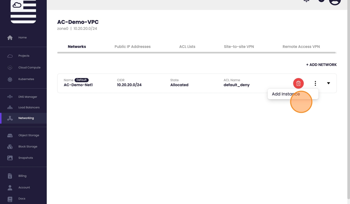 - An instance can quickly be added to the network by selecting the three dots on the corresponding network. Then selecting "Add Instance".