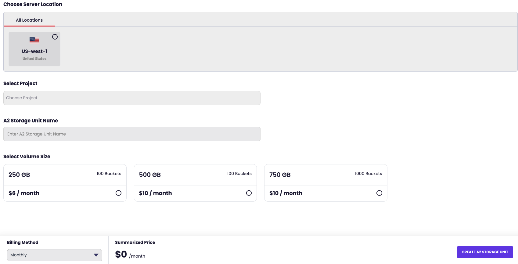 - Fill out the provided creation form which allows for full customization of A2 Object Storage. The following fields are available: