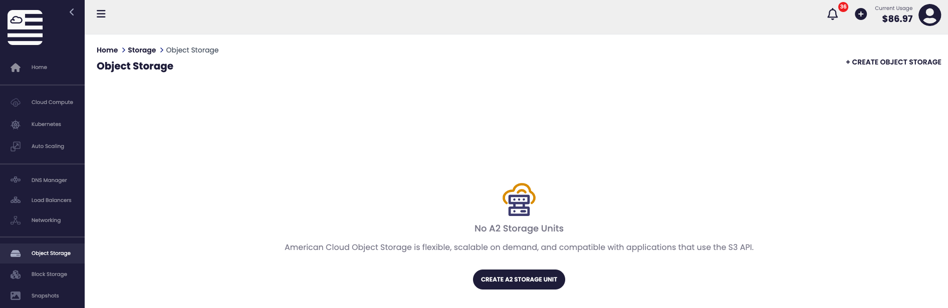 - From your JuiceFS machine use the JuiceFS CLI tool to create a new filesystem that is backed by the American Cloud A2 bucket you created in step 7. You can use the following command, replacing the values in brackets with your own information