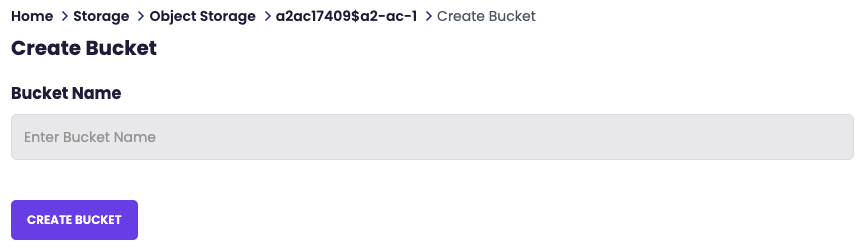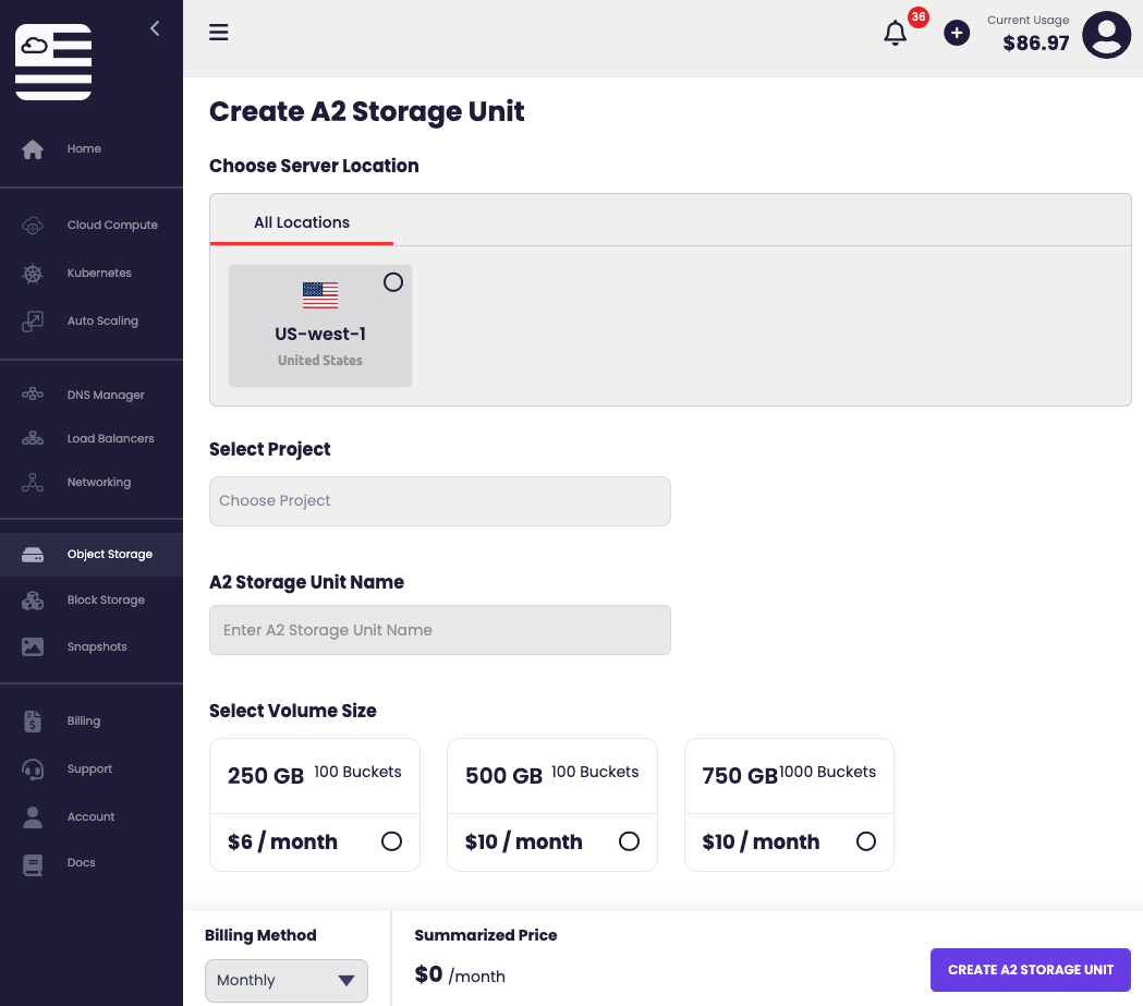 - Choose and fill out the following information location, project, A2 storage name, and volume size