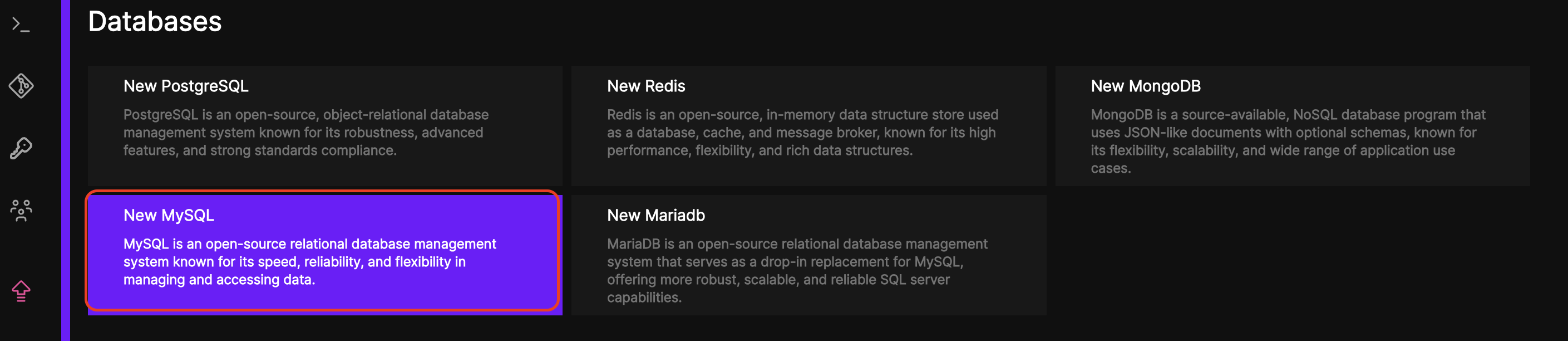 - Once the resource list is presented navigate down the page to the databases section. Select 'New MySQL'.