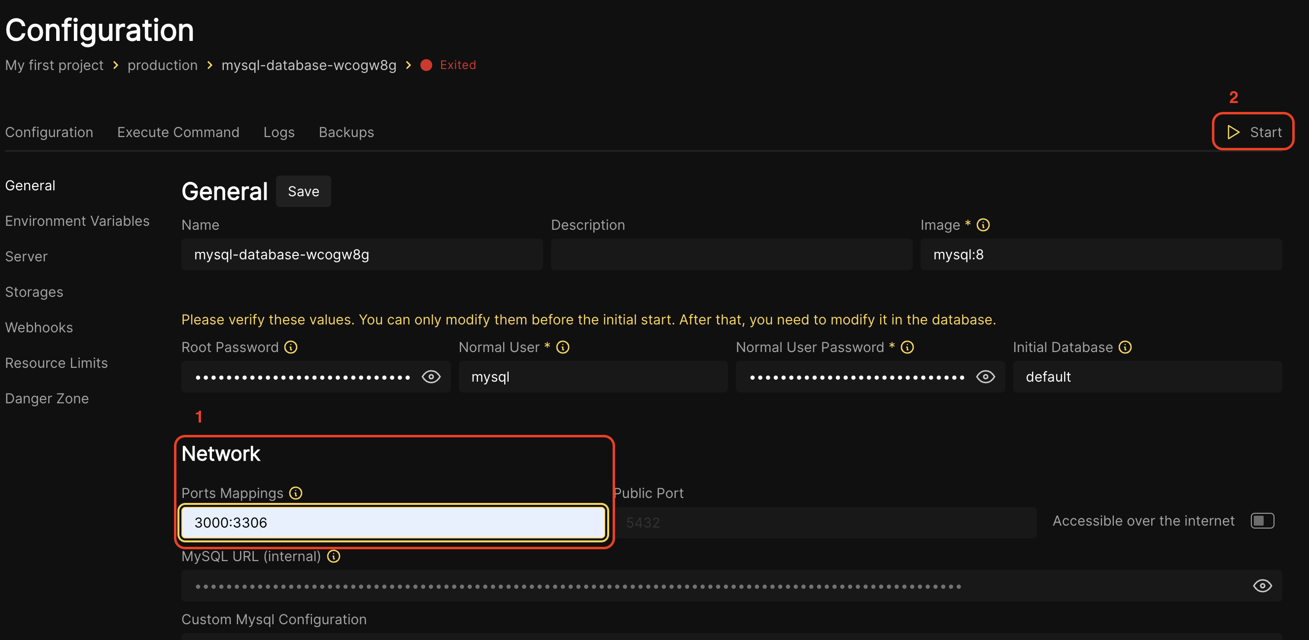 - Once the resource is complete, 1) add the desired port to communicate on. In the example port 3000 for the local machine and 3306 for the container. 2) Restart the machine to put the new configs in place.