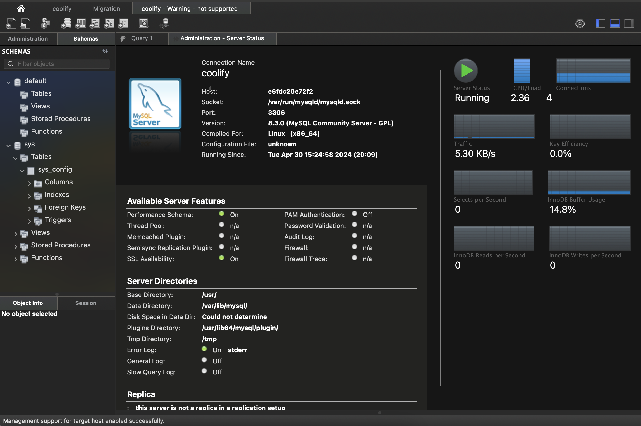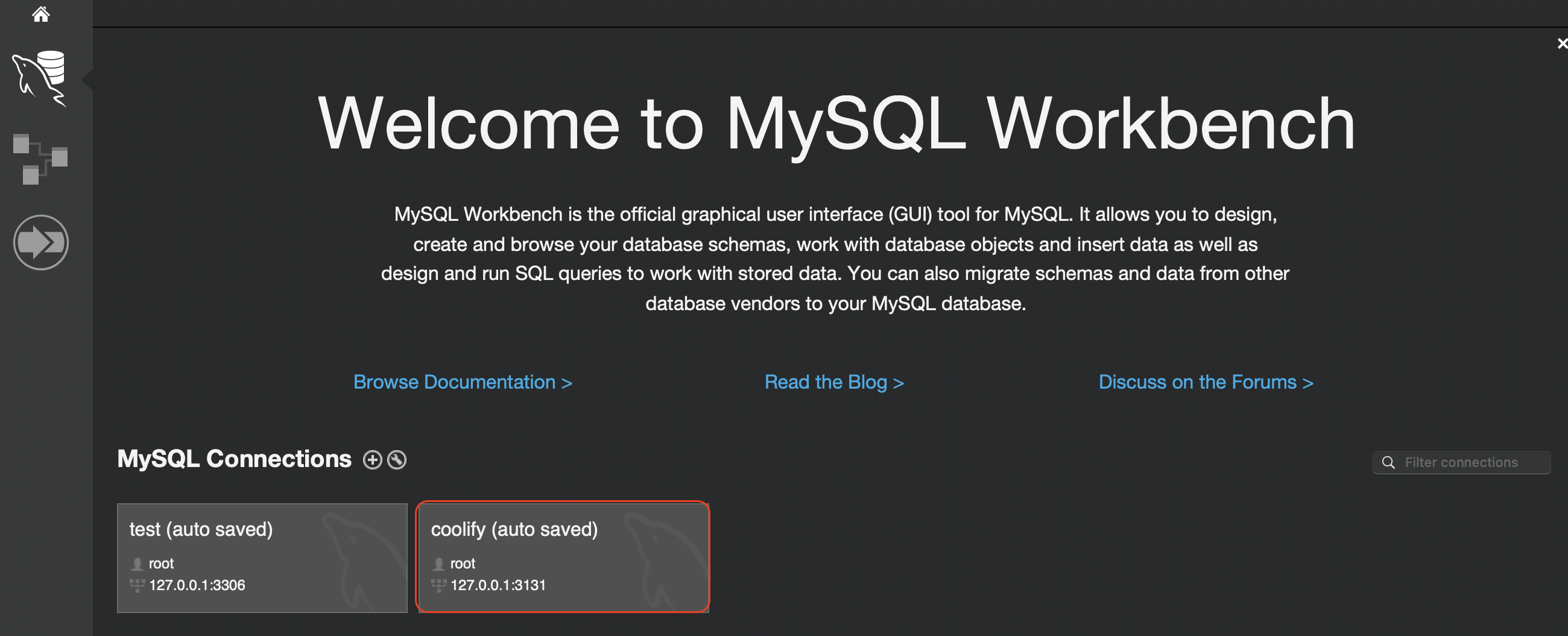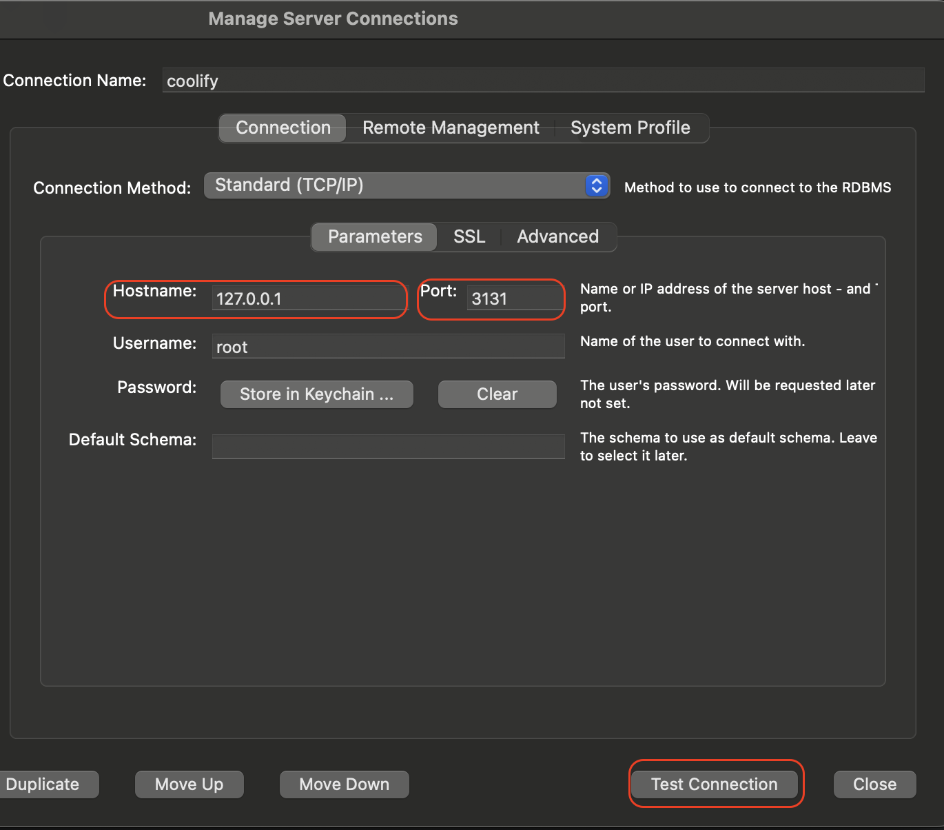 - Provide the MySQL root password from coolify in the MySQL Workbench pop up. Optionally, save the password to keychain for quick launch.